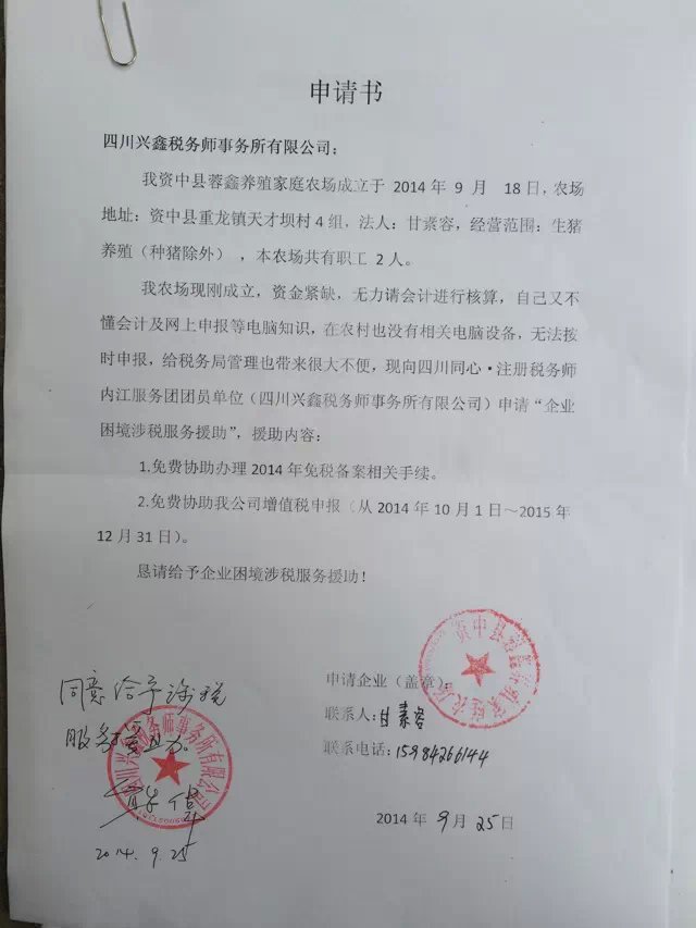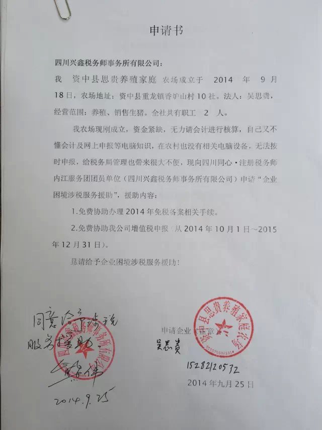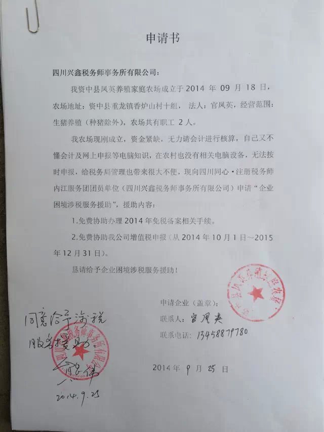 為托起困境企業(yè)騰飛的翅膀,為解決當?shù)囟悇辗志终鞴苌系碾y題,四川同心·注冊稅務師服務團團員單位(四川興鑫稅務師事務所有限公司)愿為這些請不起會計、又無力自行申報的農(nóng)庭農(nóng)場進行涉稅服務免費援助。目前共20戶家庭農(nóng)場申請了困境企業(yè)涉稅服務免費扶助(詳見后附申請書)