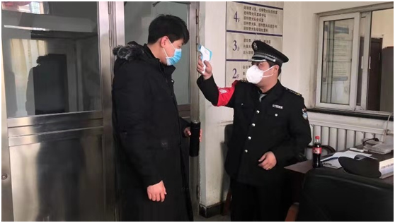 執(zhí)勤隊員正在給來訪人員測體溫