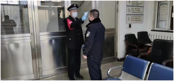 隊員為執(zhí)勤民警測量體溫